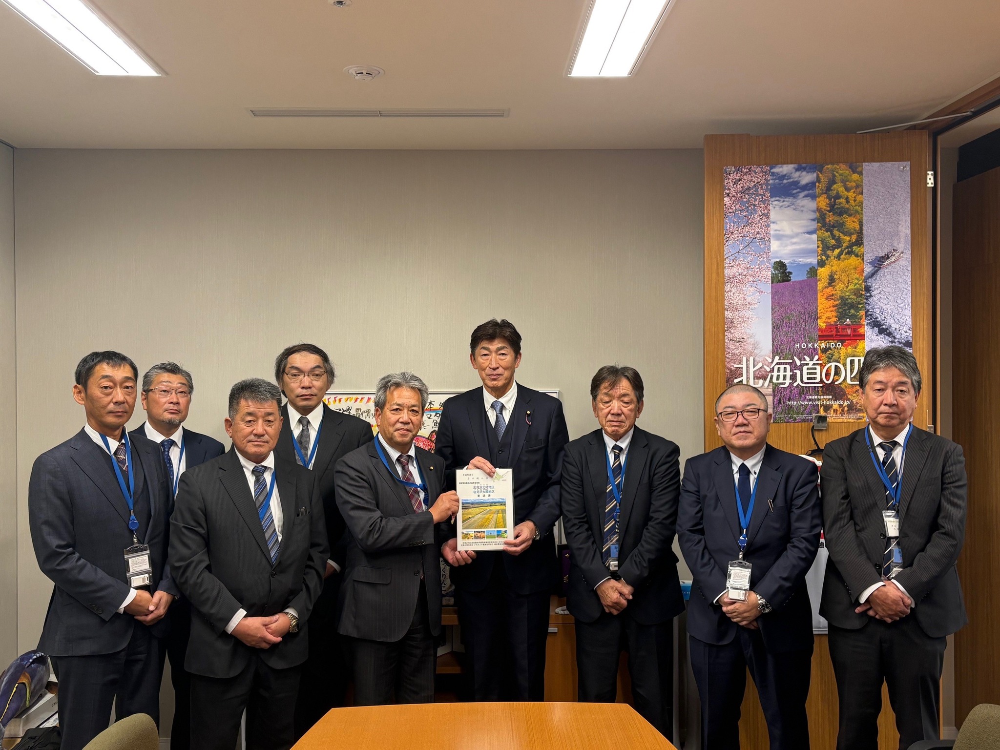 「岩見沢北村地区」「岩見沢大願地区」における国営緊急農地再編整備事業に関する要請書を頂きました。 2025年10月29日 岩見沢地区国営農地再編整備事業促進期成会、岩見沢市、北海道土地改良区、JAいわみざわ、JA峰延の皆さまより、「岩見沢北村地区」「岩見沢大願地区」における国営緊急農地再編整備事業に関する要請書を頂きました。ICTやスマート農業の先進地として発展する一方、排水やほ場整備などの課題も抱える地域の声も受け止め、持続可能な農業基盤の確立に向けて、国としての支援と必要な予算確保に全力で取り組みます。
