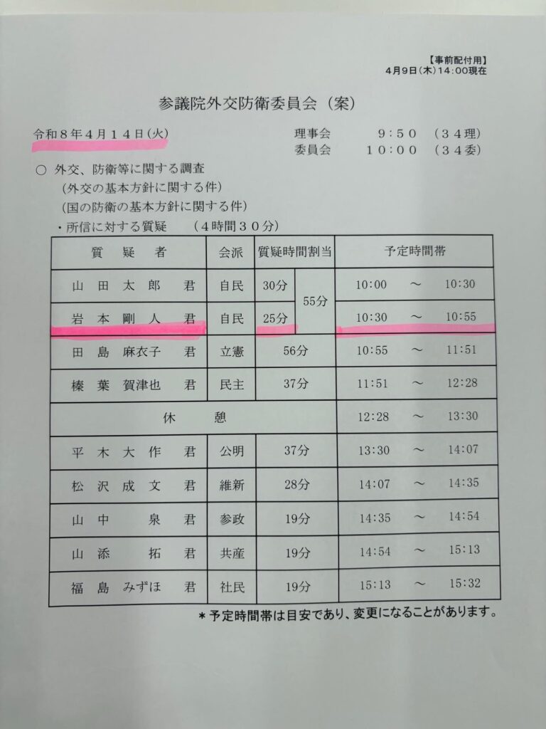 参議院外交防衛委員会の質問に立ちます。 2026年4月14日 お知らせです📢4月14日(火)10:30から10:55まで25分間参議院外交防衛委員会の質問に立ちます。お時間がある方は参議院のネット配信で是非ご覧ください!!