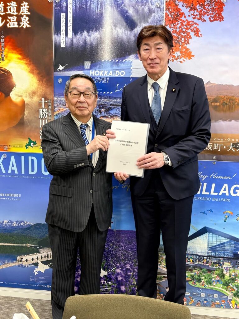 恵庭市原田市長より、今冬の道路除排雪の財政支援に関する要望書を受け取りました。 2026年2月20日 恵庭市原田市長より、今冬の道路除排雪の財政支援に関する要望書を受け取りました。恵庭市では記録的な降雪により、連日の除排雪対応が続き、交通や市民生活への影響も深刻化しています。新聞報道からも、現場の厳しい状況を改めて認識しました。地域の安全・安心な暮らしを守るため、必要な財政支援が確実に行き届くよう、国としてもしっかり取り組んでまいります。