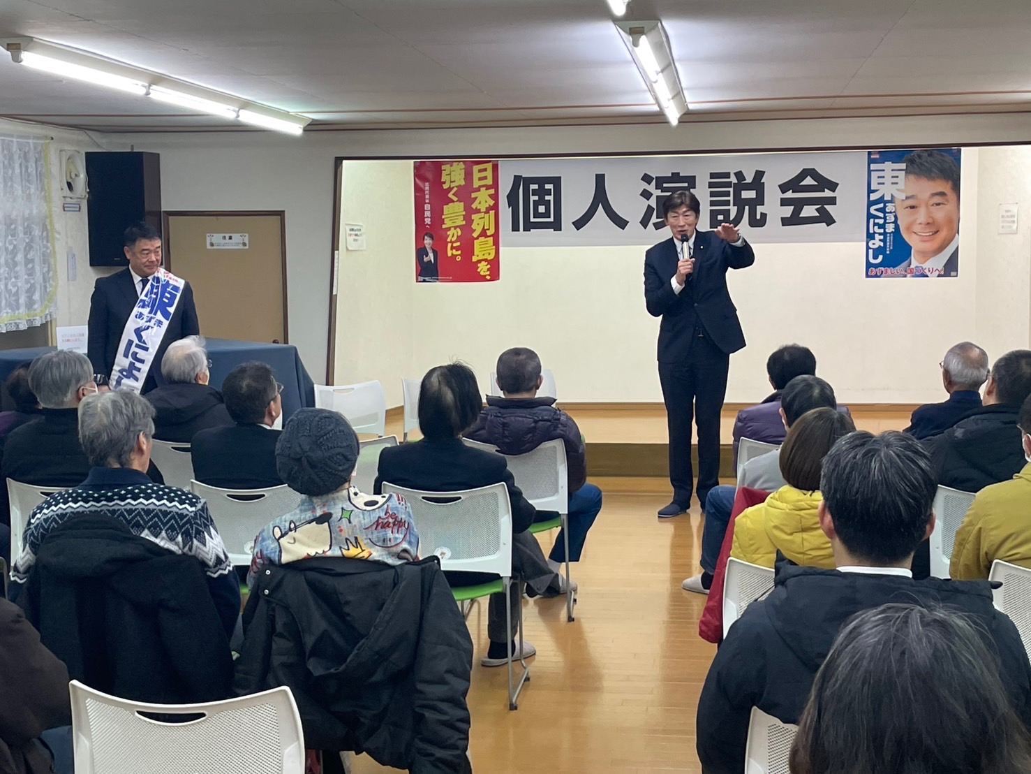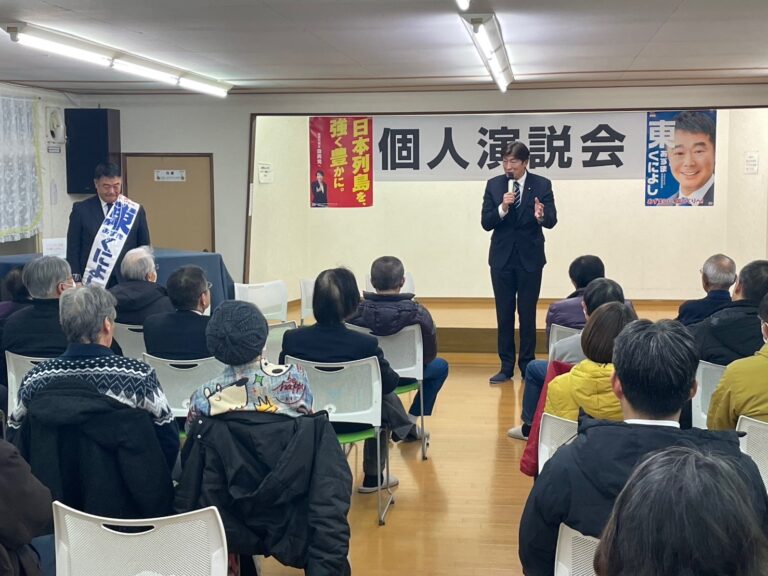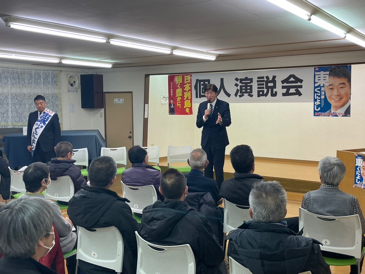 旭川市神楽岡の神楽岡八区町内会館にて、衆議院議員選挙 自民党公認候補 東くによしさんの個人演説会が開催されました。 2026年2月4日 令和8年2月4日(水) 旭川市神楽岡の神楽岡八区町内会館にて、衆議院議員選挙 自民党公認候補 東くによしさんの個人演説会が開催されました。私も同行させていただき、東くによしさんと自民党へのご支援を訴えさせていただきました。選挙戦も終盤となりましたが、引き続きご支援・ご協力のほどよろしくお願い致します。
