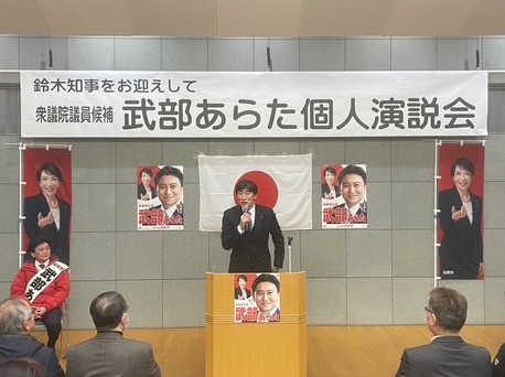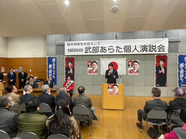 第十二選挙区 自民党公認候補 武部あらたさんの個人演説会が網走市で開催されました。 2026年2月3日 令和8年2月3日(火) 第十二選挙区 自民党公認候補 武部あらたさんの個人演説会が網走市で開催されました。支援者の皆さんはじめ多くの方々が出席されており、鈴木直道知事にもご登壇いただきました。十二区の皆さん、武部あらたさんと自民党をよろしくお願い致します