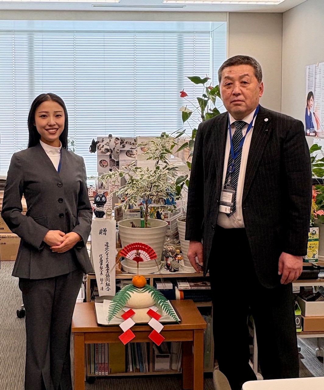 道北なよろ農業協同組合 村上組合長と北海道米アンバサダーの横倉さんより、鏡餅を贈呈いただきました。 2025年12月26日 道北なよろ農業協同組合 村上組合長と北海道米アンバサダーの横倉さんより、鏡餅を贈呈いただきました。事務所が新年らしい装いになりました。