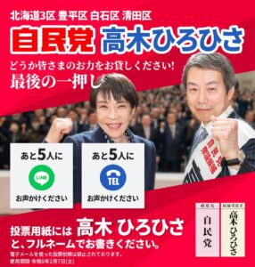 北海道第三選挙区 自民党公認候補 高木ひろひささんと自民党をよろしくお願い致します。 2026年2月6日 北海道第三選挙区 自民党公認候補 高木ひろひささんと自民党をよろしくお願い致します。 投稿を読む »